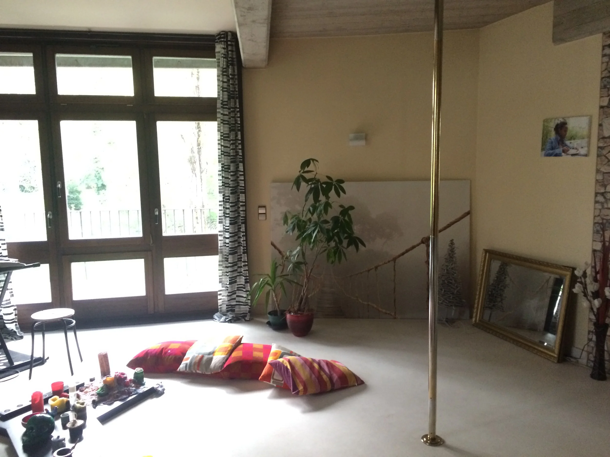 Jojo's pole is surrounded by candles cushions for sitting on.